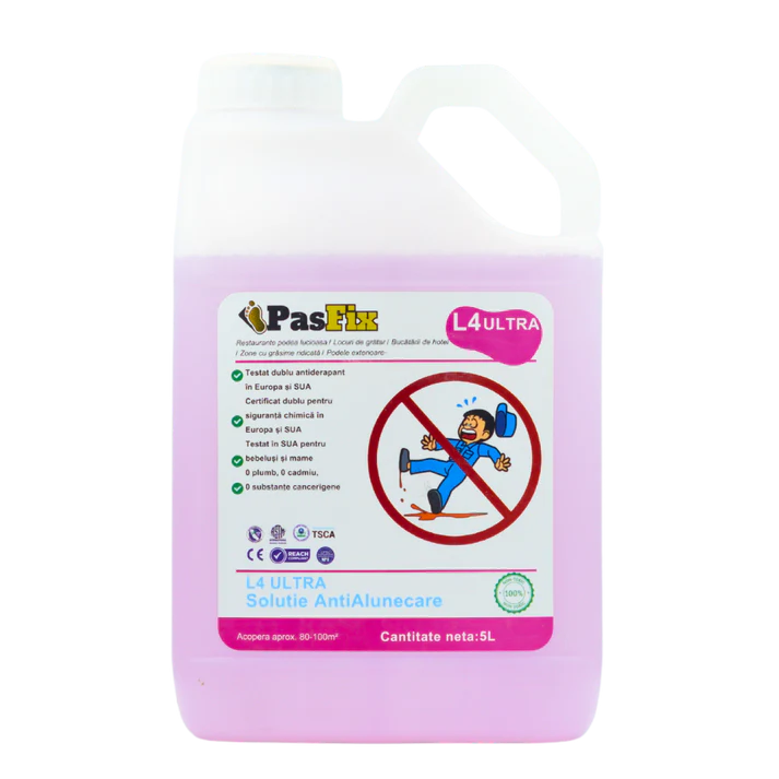 PasFix L4 ULTRA 5L este soluția antialunecare de top, destinată spațiilor unde riscul de alunecare este extrem de ridicat. Ideală pentru bucătării de hotel, restaurante, locuri de grătar, podele lucioase și suprafețe exterioare expuse umezelii sau grăsimii. Formula sa puternică oferă aderență profesională fără a afecta aspectul pardoselii.